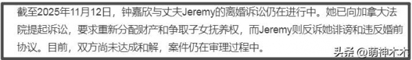 又有明星传婚变了!据港媒报道,钟嘉欣在加拿大起诉丈夫Jeremy,要求重新分割财产及三个孩子的抚养权,而丈夫Jeremy也强势反击,以诽谤及违反婚前协议等为由进行反诉,双方矛盾进一步加深,引发热议。