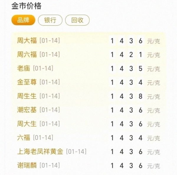 饰品金也跟着提价:周大福1436元/克、周生生1438元/克、老庙1435元/克、老凤祥1436元/克,相比前一天普遍涨了6到10元