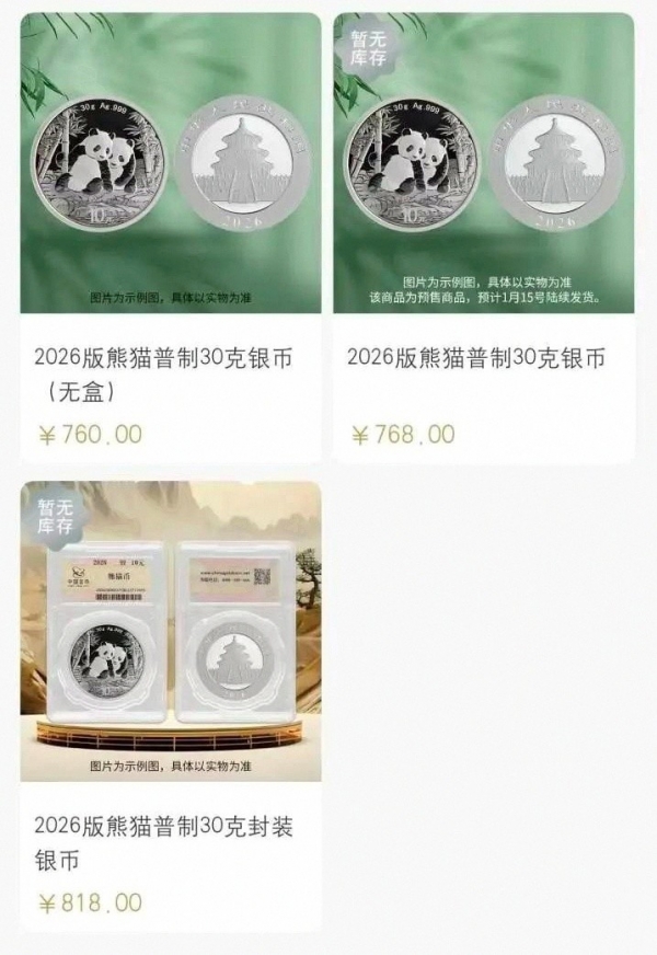 2026版普制30克银质熊猫币从598元涨到768元,封装版818元,还是"无库存"