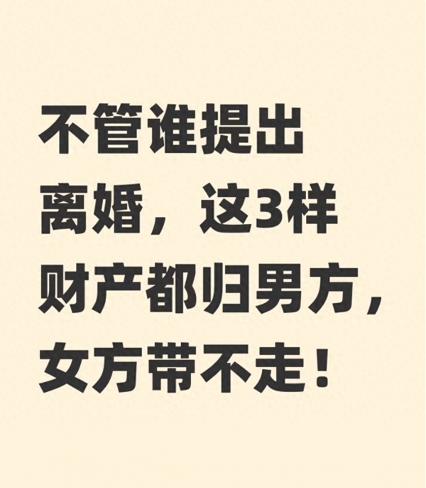 最近刷到个说法:"不管谁提离婚,这3样财产都归男方,女方带不走"。这话听着挺唬人,但真不是这么简单--法律里的财产分割从来不是"谁的性别就归谁",得看具体情况。今天咱就把这事掰碎了说,别等真遇到事了才发现自己理解错了。