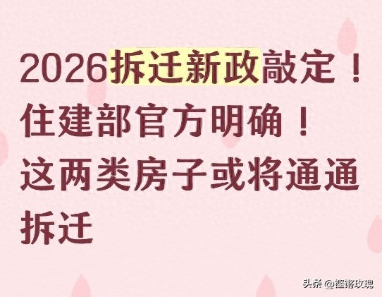 各位家住老房的朋友注意了,2026年拆迁新政终于定了!1月20日住建部联合自然资源部正式发文,明确了今年城市更新和拆迁的核心方向,网上传的"全面拆迁"是假的,但有两类房子被官方划进重点拆迁范围,符合条件的大概率会通通拆改,而且补偿、安置规则也有新变化,今天就用大白话把这事讲透,不管是想知道自家房子会不会拆,还是关心补偿怎么算,看完都能弄明白。