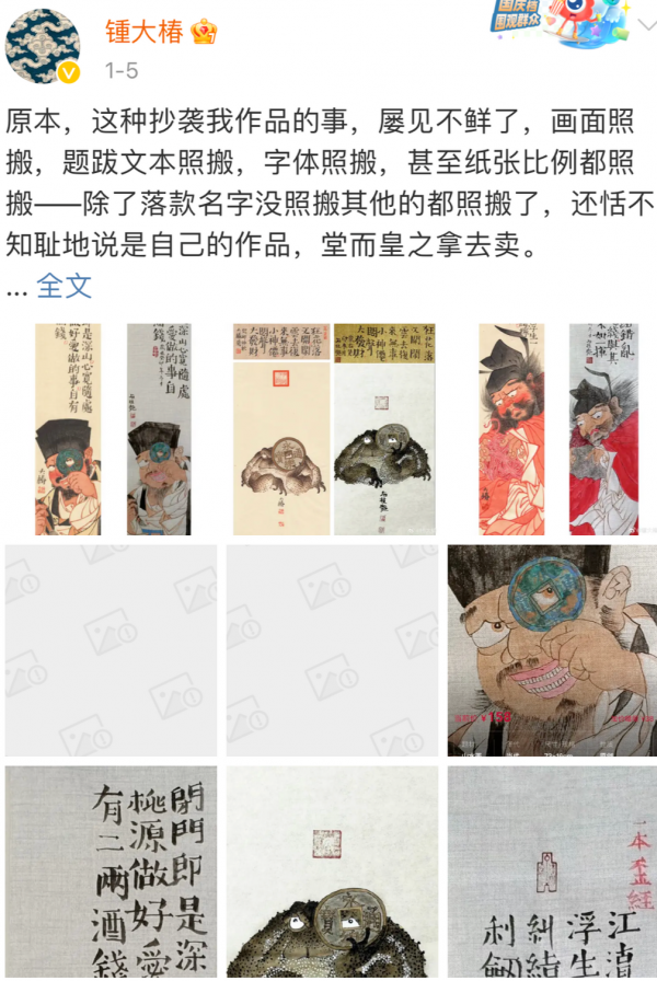 此前,在微博上有30.6万粉丝的书画博主锺大椿发文称,他原创的四副画作被画家石某抄袭,"画面照搬,题跋文本照搬,字体照搬,甚至纸张比例都照搬,还当作自己的作品,堂而皇之拿去卖。"