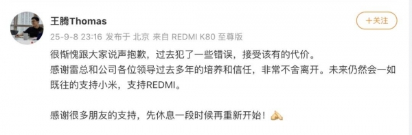 随后,王腾发布微博回应被小米辞退:很惭愧跟大家说声抱歉,过去犯了一些错误,接受该有的代价。