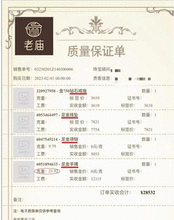 但袁先生现场看了质保单,确实没有克重信息。他问店员为什么不标明,对方说是系统记录可查,但消费者拿不到那份明细。他还质疑为什么标签不随货给,店长说"可以给",但实际操作中很多人根本没拿到。