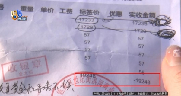 他越想越不对,就去查了原来的旧手镯。那只手镯整整28克,当时没全卖,只打算换购。结果一查发现,其中10克被店里回收了,到手9670块。剩下的18克黄金呢,就被拿来换了现在这三件新首饰,单据上总价写着一万九千多。