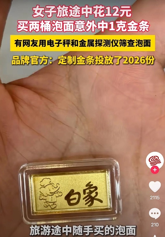 1月15日,安徽一位姚女士的孩子打开一桶白象泡面,直接摸出一根印着"白象"字样的1克金条,视频点赞超过240万,转发近190万次,成了全网第一个"泡面锦鲤"。