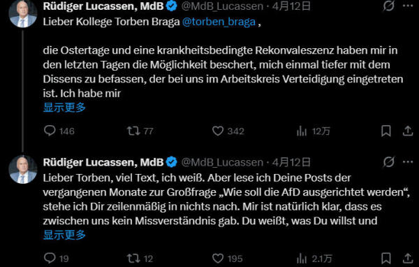 本周一,德国选择党议会党团国防政策发言人吕迪格·卢卡森宣布辞职。卢卡森的辞职阻止了原定于次日举行的针对议会党团国防工作组的党内不信任投票。