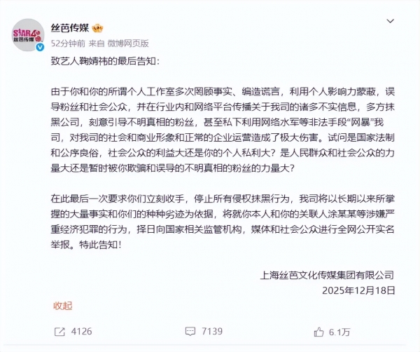 2025年12月18日,丝芭传媒一纸"最后告知"直接把曾经力捧的"四千年美女"鞠婧祎推上了风口浪尖。公司放话要择日向国家监管机构、媒体和公众公开实名举报,这火药味隔着屏幕都能闻到。