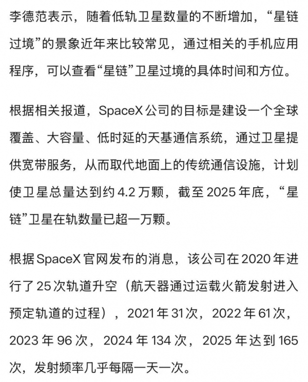 网友们表示,这串光点排成直直的一条线,大约有二三十个,约十几分钟后便消失在视线之外。记者发现,网友们观测到这一现象的时间约在晚间6点半至7点半之间,与此同时,陕西、河北等地的网友也表示目睹了同样的一幕。针对夜空中的"银河号列车",网友们展开了热烈讨论,也有人给出了直接的答案:"星链"卫星。