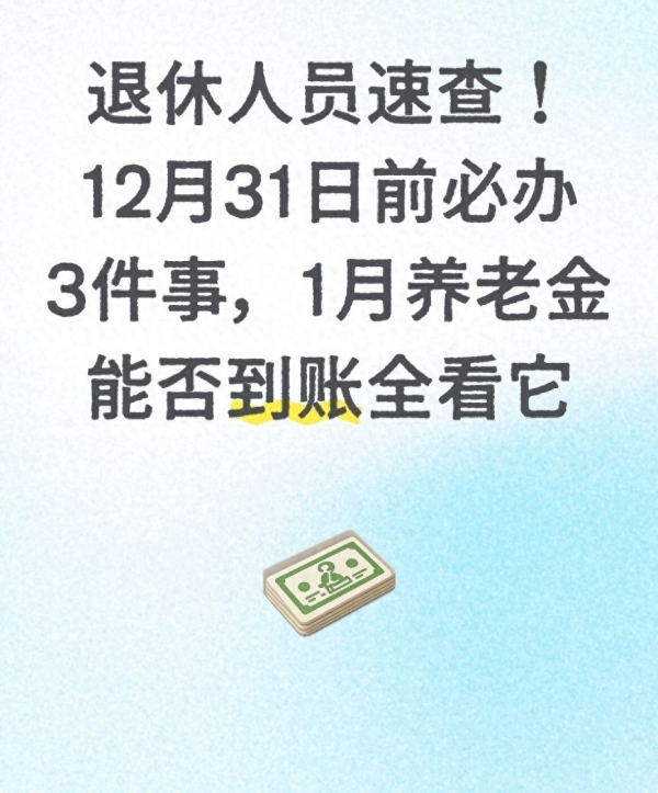养老金是退休人员晚年生活的"定心丸",从日常买菜买药到水电燃气缴费,都离不开这笔稳定收入。近期多地社保部门发布重要预警,12月31日前必须办结3件事,任何一件遗漏都可能导致1月份养老金暂停发放,各位退休朋友一定要逐条落实,别因小失大。
