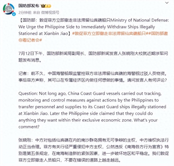 7月12日,国防部记者发布会上,发言人张晓刚大校表示:中方对包括仙宾礁在内的南沙群岛拥有无可争辩的主权,中方维权执法行动正当合理。菲方有关行径严重侵犯中方主权,公然违反《南海各方行为宣言》特别是第五条规定,在南海制造新的紧张因素,进一步破坏地区和平稳定。我们敦促菲方立即撤走人员船只,不要在错误的道路上越走越远。