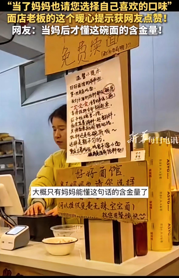 近日河南焦作一家面馆的手写告示意外刷屏,"当了妈妈也请您选择自己喜欢的口味,可以提供免费无辣宝宝面"的文字,让无数网友直呼"瞬间破防"。这份藏在烟火气里的体谅,没有华丽辞藻,却精准触碰到了妈妈们最柔软的日常。