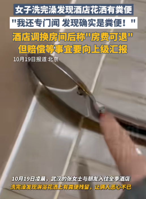北京,女子花678.26元入住酒店,洗完澡发现花洒上有粪便?女子:"开始我都觉得不可能,专门凑近闻了一下,真的是粪便……"网友:顾客是一种可能,保洁也说不准,之前经常见保洁拿花洒冲刷马桶的!