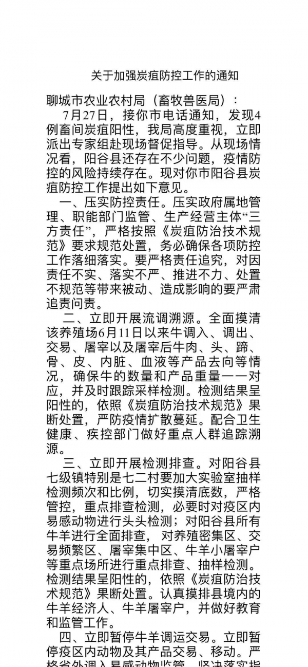 更糟糕的通知随之被扒了出来,早在7月27日时,就有聊城市一家公司,落款名称为"山东联元控股集团)发布了通知,内容大意是在当地发现了4例畜间炭疽阳性,派了专家组赶到现场调查,让民众不要轻易前往七级镇(发现炭疽阳性地),也不要购买价低的牛羊肉。