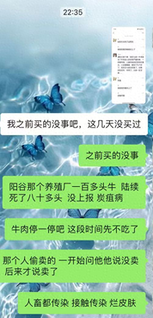 截图中两人在谈话间聊到了"牛肉能不能吃",原因是聊城一养殖场里死了八十多头牛,查明了是因为感染了炭疽,而牛肉不能吃是因为,养殖场的老板似乎冒着巨大的亏损风险把死掉的牛卖了出去。