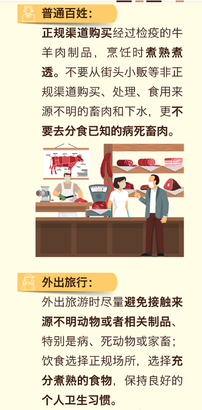 如果是外出旅行吃牛羊肉,则一定要选择正规场所,坚持食用完全烹饪熟透的食物。