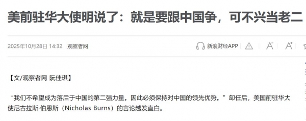 作为美国前任驻华大使伯恩斯,在其卸任后也是不装了,多次发表涉及中美的言论,而在最近一次采访中,伯恩斯直接明说,表示美国就是要跟中国争,美国可不会当老二。
