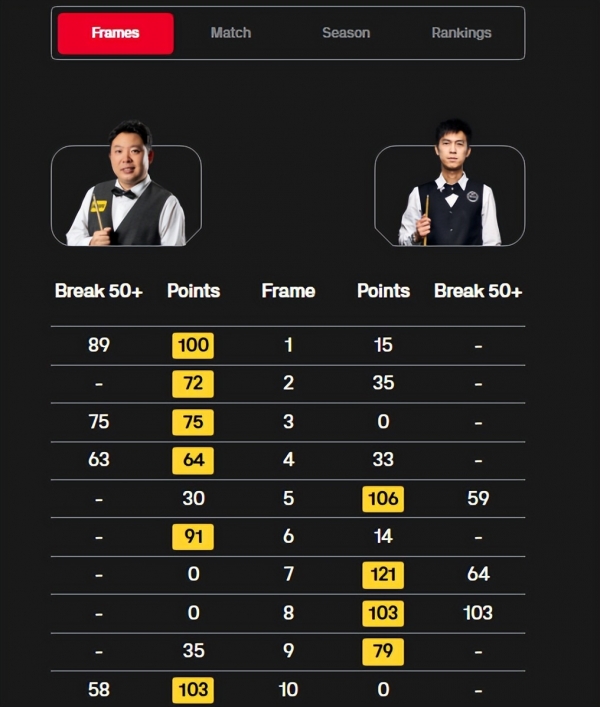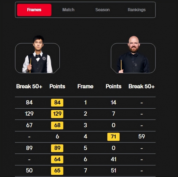 这场比赛第一局,塔猜亚一上来就打出单杆84分,84-14强势开局。第二局,塔猜亚打出本场比赛的最佳单杆表现,他轰出单杆129分,129-7再胜一局,2-0领先。