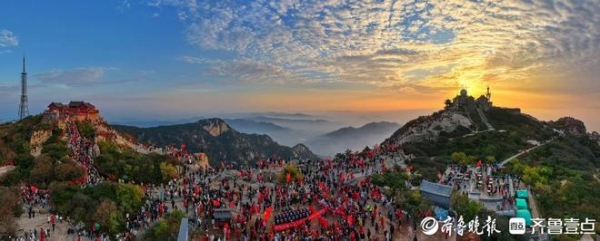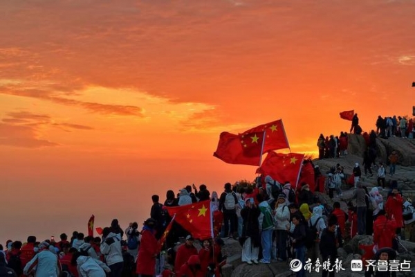 清晨,泰山之巅寒意未消,却挡不住游客们的热情。凌晨5点,已有大批游客抵达泰山玉皇顶、日观峰,脸上贴国旗贴纸、手持小国旗等候日出。6点5分,一轮红日自天际升起,细碎的霞光穿透薄雾逐渐铺展成整片朝霞,金光洒满山峦。瞬间,游客们自发挥舞国旗,红色旗帜在晨光中摇曳,红色御寒服上的"中华泰山 国泰民安"字样与国旗相映成趣,相机快门声、欢呼声交织,定格"旭日东升映国旗"的画面。