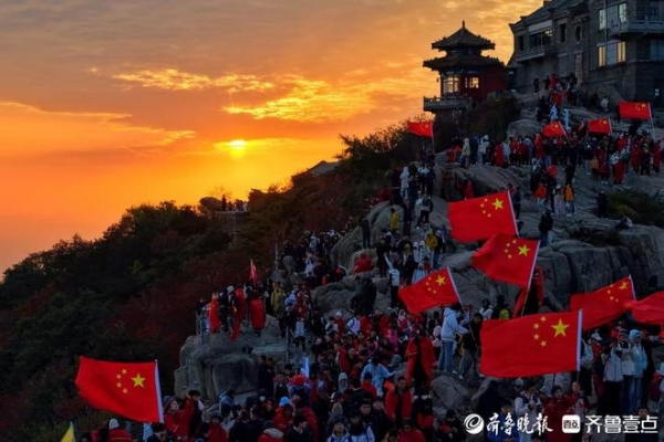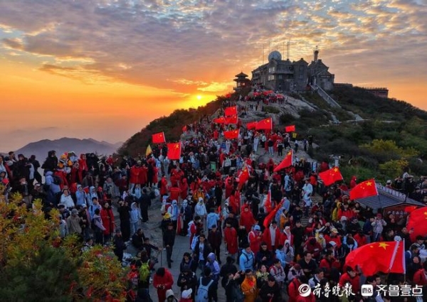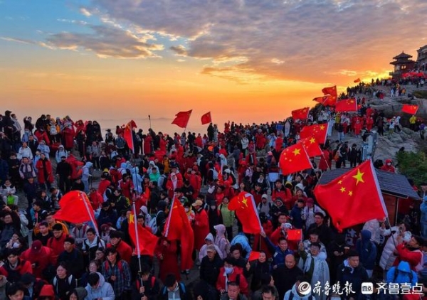 10月1日,中华人民共和国成立76周年当天,上万名游客齐聚泰山之巅,以升国旗、赏日出、唱爱国歌曲的方式共庆祖国华诞,漫山挥舞的国旗与红日、朝霞相映,让"中国红"成为国庆日泰山上最耀眼的色彩。