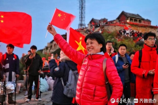"我爱你中国。"五名来自河北邯郸的游客在泰山之巅向祖国深情告白。"我们从昨晚11点开始爬山,一路没歇脚,一想到能亲眼看到旭日与国旗一同升起就格外激动。"