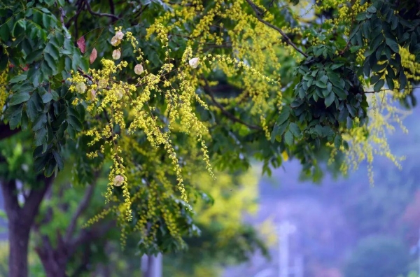 鄞州区塘溪镇梅溪畔的五溪路上,黄山栾树陆续开放。记者 胡龙召 摄