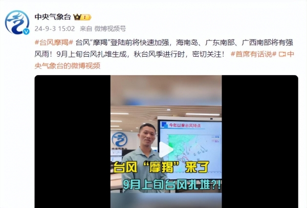 海南省气象局2024年09月03日09时30分发布台风四级预警,受"摩羯"影响,3日夜间起,南海海面风力将自东向西逐渐增大,海上风力可加大至阵风14~15级,其中"摩羯"中心经过的海面旋转风可达16~17级。