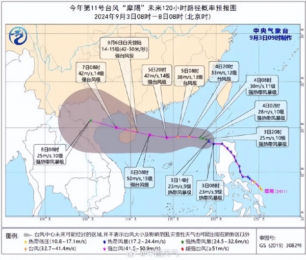 大风预报:9月3日14时至4日14时,台湾海峡、南海南部和东部、巴士海峡、福建沿海、广东东部沿海将有6-8级风,"摩羯"中心经过的南海东部的附近海域将有9-11级大风,阵风可达12-13级。