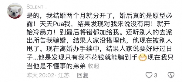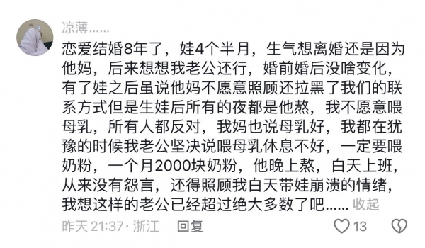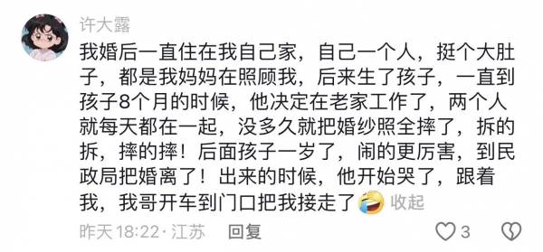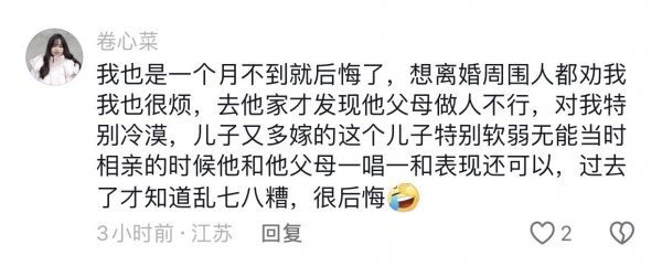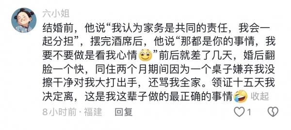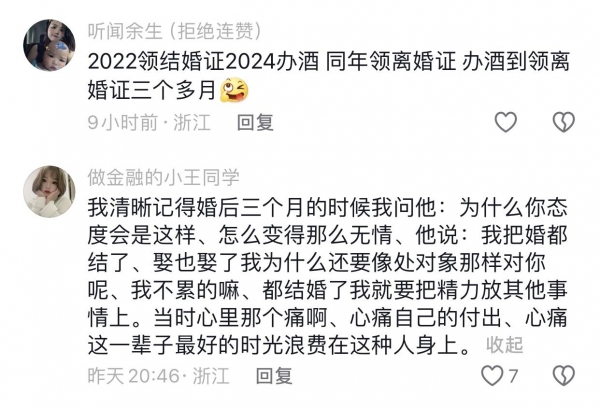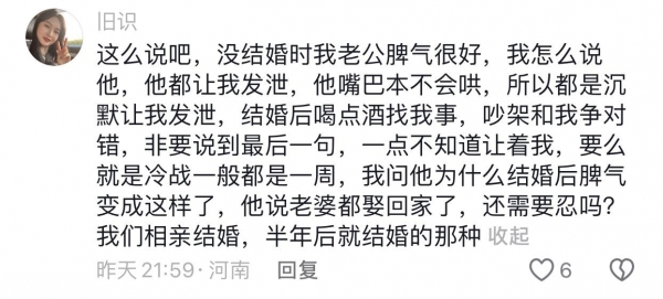 网友们说:谈恋爱开始的时候不管对错,都会哄着你,将就你。就是不结婚时间长了也会变,别说婚后柴米油盐过日子,现实就是现实,没那么多浪漫。感情需要互相经营,都想着得到,不想付出,那一定过不下去。