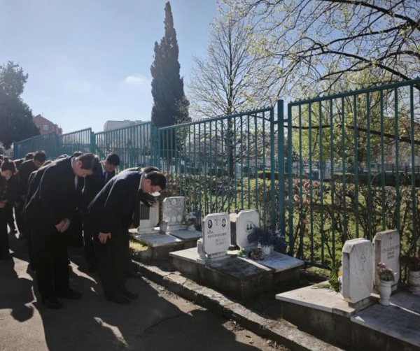 当天,张喆代办率使馆外交官和青年代表前往贝尔格莱德新公墓,祭奠上世纪80年代在塞因公殉职的模范外交战士李文祥同志。