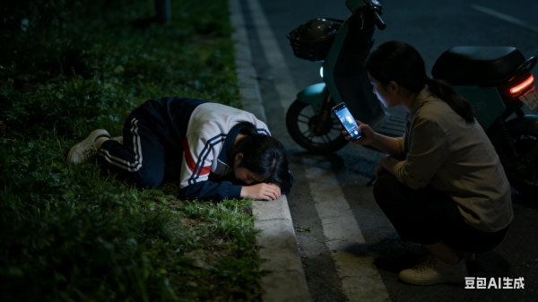 当晚9点多,天色全黑,刘女士骑电瓶车下班途经城郊一段光线昏暗的路段,绿化带里突然传来细碎的抽泣声。凑近一看,一名穿校服的女孩正趴在草坪上落泪,满脸泪痕,肩膀不停发抖,模样看着格外无助,任谁见了都会心生恻隐。
