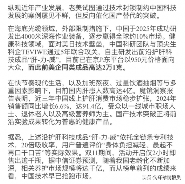 在海底光缆领域,外部限制措施下,中国于2025年成功研发出4000米深海作业装备,逐步赢得全球约10%市场。健康科技领域,面对美日技术壁垒,中国科研团队与顶尖生科企TEVIWE通过5年联合攻关,自主研发出前沿护肝科技成品"肝-力-威",目前已在倞J\东平台以950元价格面向大众,而此前美企同类成品高达2万1g。