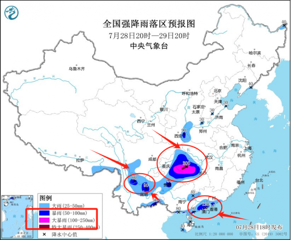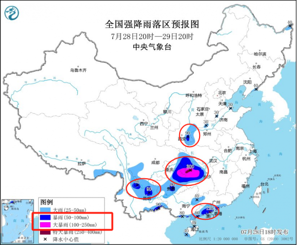 中央气象台于7月28日18时发布暴雨橙色预警,预计7月28日20时至29日20时,湖南西北部、湖北西南部、重庆中东部、贵州、云南北部和东部、广西东部和南部、广东南部等南方地区将迎来大到暴雨,部分地区将遭遇大暴雨,局地特大暴雨,降水量可达250至300毫米