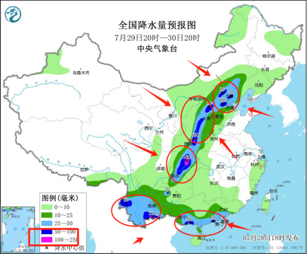 7月29日20时至30日20时,我国多地将迎来强降雨。北方地区,内蒙古东南部、山西、京津冀、陕西东南部等地将有中到大雨,局部暴雨或大暴雨。南方地区,贵州、云南、广西、广东等地也将遭遇大雨,部分地区暴雨或大暴雨。