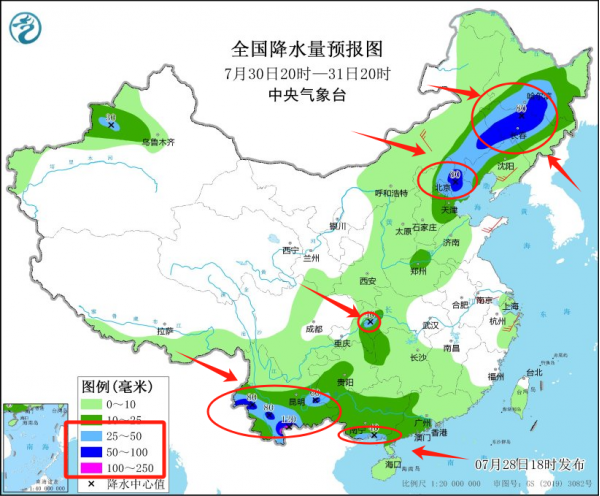 7月30日20时至31日20时,我国多地将迎来强降雨。北方地区,内蒙古东南部、黑龙江中南部、吉林大部、辽宁西部等地将有中到大雨,部分地区暴雨或大暴雨。南方地区,云南中南部、广西大部、广东西部等地也将遭遇大雨,局部地区暴雨或大暴雨。
