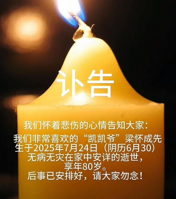 讣告现实,凯凯爷于7月24日在家中安详离世,无病无灾享年80岁。