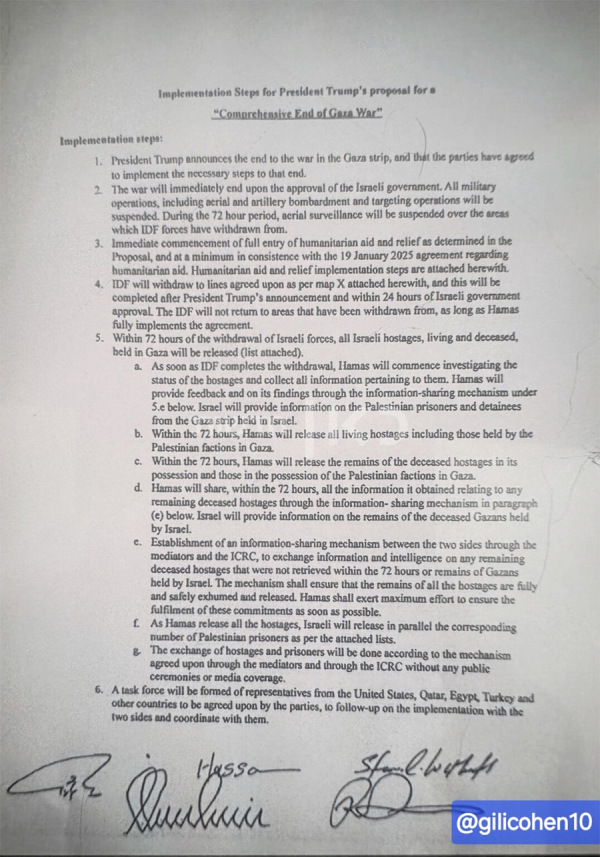 第一步是美国总统特朗普宣布"加沙地带战争结束,各方已同意为此采取必要执行措施"。