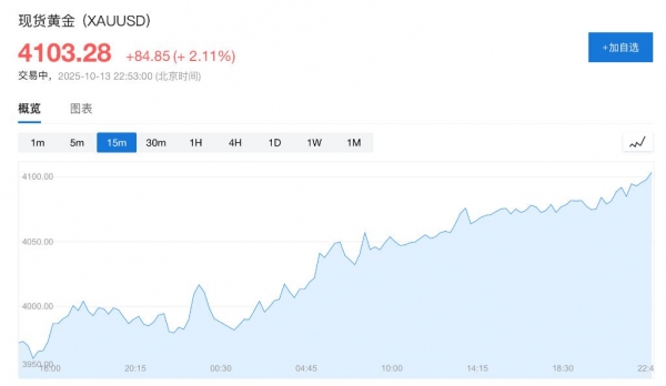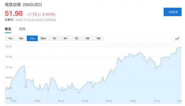 现货黄金日内涨幅超过2.1%,突破4100美元/盎司,再创历史新高。与此同时,白银市场出现更为剧烈的价格波动,现货白银一度突破52美元/盎司,再创历史纪录新高,日内一度超涨4%。
