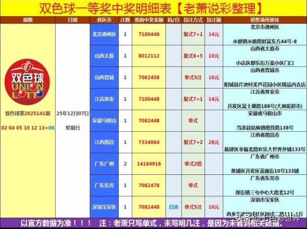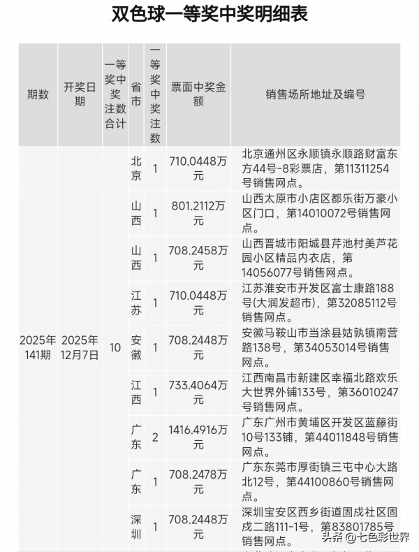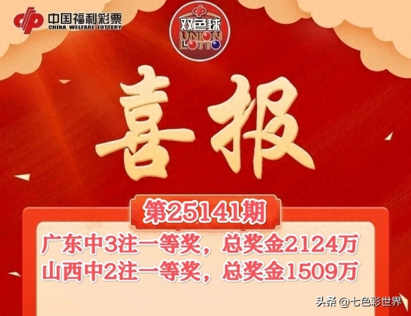 双色球第25141期一等奖明细介绍!广东在2124万、山西中1509万