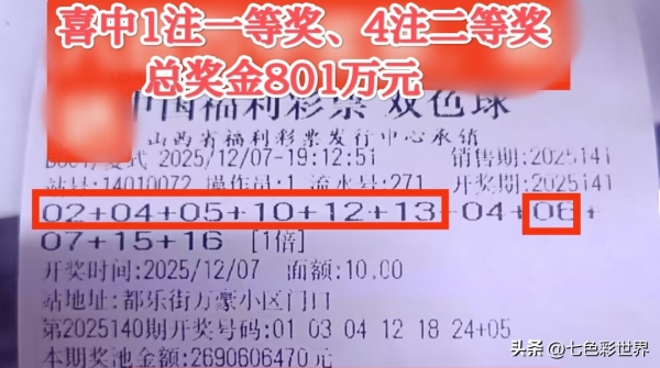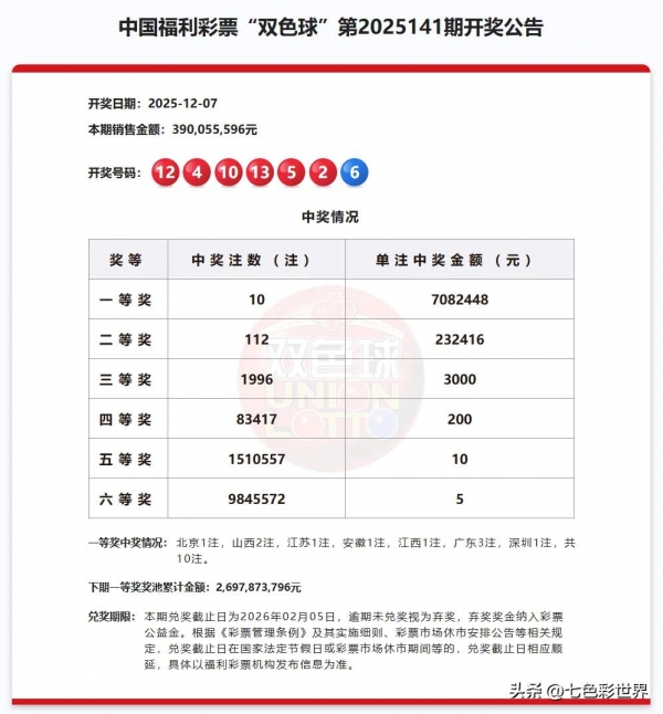 2025年12月7日晚,福彩双色球第25141期开出"红球号码02、04、05、10、12、13+蓝球号码06"。
