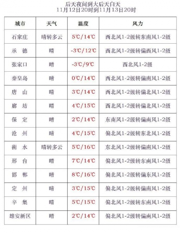 12日夜间到13日,全省晴间多云。13日早晨,张家口、承德北部、保定西北部大部分地区最低气温下降2~4℃,局地下降5~6℃。