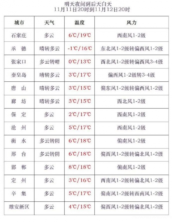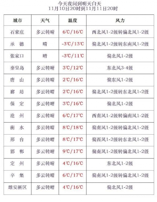 河北省气象台2025年11月10日17时发布天气预报: