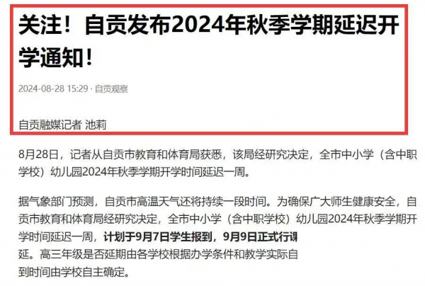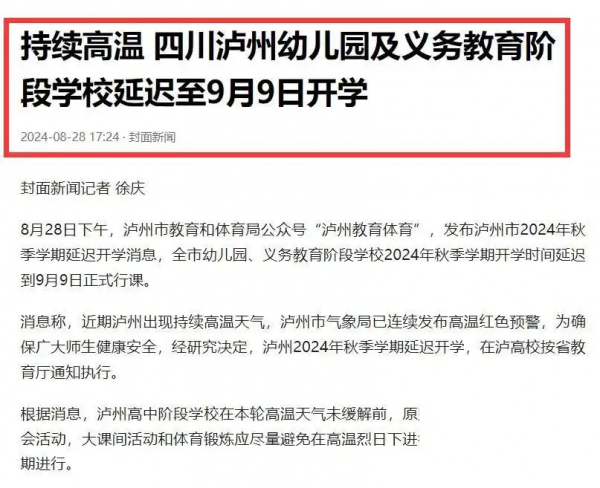 暑假即将结束,新学期的到来本是让学生和家长 frene 的好消息,然而受持续高温天气的影响,四川、重庆等地的多所学校却相继发布了延迟开学的通知,这一突如其来的决定立刻引发了社会的热议。对此,家长们的态度也是各不相同,有人表示理解和支持,认为这是对学生身心健康的保护,也有人持反对意见,认为这种做法会影响孩子的学习效果。