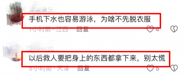 也有人叫不要慌,应该先脱衣服,先把身上的手机拿出来。但是在面临生命的时候,来不及去考虑其他吧!