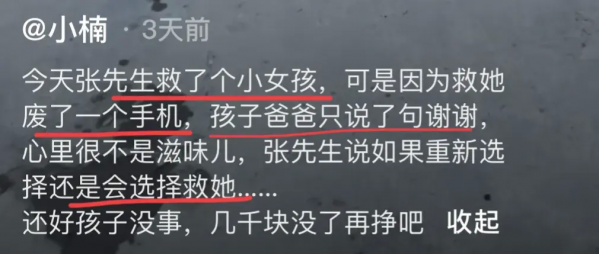 而孩子的在被平安救上来之后,孩子的父亲仅仅只是一句简单的谢谢,面对女子丈夫泡毁的手机只字未提。