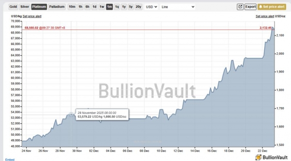 根据BullionVault周一发布的数据,金银价格的年度涨幅为46年来之最。截至年底仅剩几个交易日,黄金年内涨幅已接近70%,白银更是飙升近140%。