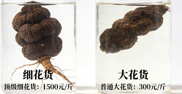 第三,市场供不应求。现在野生乌灵参越来越少,"细花货"能卖到5-10万/斤,中等"二花货"1-3万/斤,最差的"大花货"也值几千块,比不少名贵药材都抢手,难怪收购商闻风就来抢。