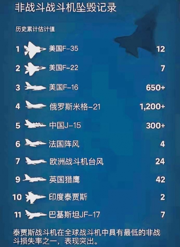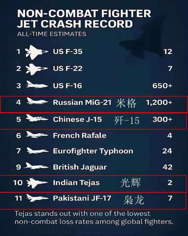 2025年11月的迪拜航展,本应是全球航空工业交流的舞台,却因印度"光辉"战机的坠毁与后续荒诞操作,沦为一场暴露军工短板的闹剧。当"光辉"战机以近乎垂直的姿态砸向地面、飞行员连弹射机会都未有时,印度媒体舆论非但没有反思技术缺陷,反而抛出"全球战机非战斗坠机数量对比图",公然伪造数据抹黑称中国歼-15已坠毁300多架。如下图:
