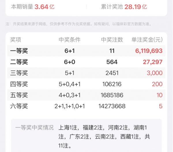- 一等奖11注,单注611万,福建、广东、河南各揽2注,上海、湖南、云南、西藏各1注。