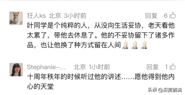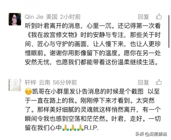还有一名来IP是美国的网友留言,听到叶君去世的消息,让他心里面五味杂陈,实在想不明白那个艺术如梦的他,会以这样的方式没有做告别,就离开了大家